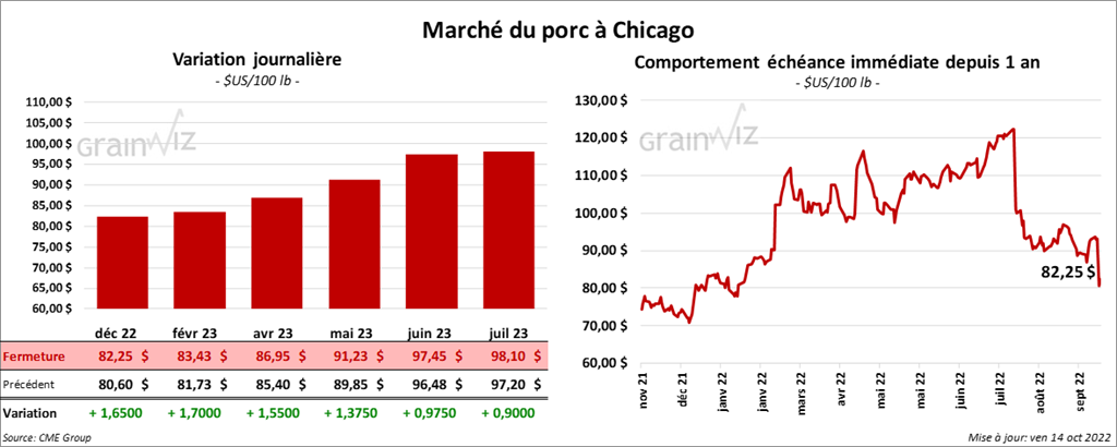 - Le 12 octobre dernier, le CME Lean Hog Index était en hausse de 18 cents à 92,67 $.