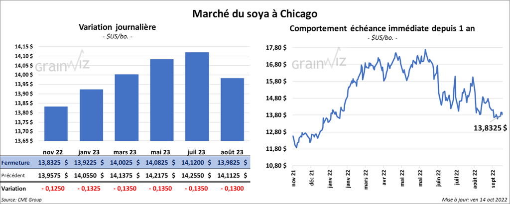 Les contrats de soya US aux échéances les plus rapprochées ont clôturé avec des pertes entre 12 ½ et 13 ½ cents. Ceux de tourteau de soya US aux échéances les plus rapprochées ont fini la session entre le neutre et une baisse de 20 cents/tonne. Les contrats d’huile de soya US aux échéances les plus rapprochées ont également terminé en recul entre 44 et 113 points.