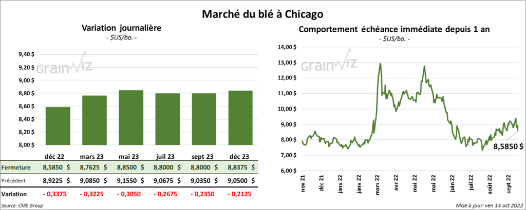 À Chicago, les contrats de blé aux échéances les plus rapprochées ont fermé en baisse entre 30 ½ et 33 ¾ cents. À Kansas, ceux de blé dur rouge aux échéances les plus rapprochées ont terminé en recul entre 27 ½ et 29 ¼ cents. À Minneapolis, les contrats de blé de printemps aux échéances les plus rapprochées ont aussi fini dans le rouge entre 21 ¼ et 23 ¼ cents.