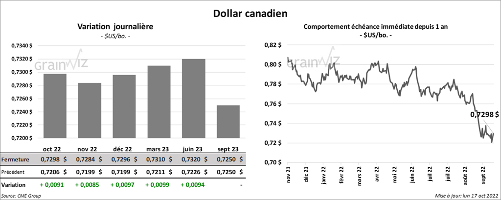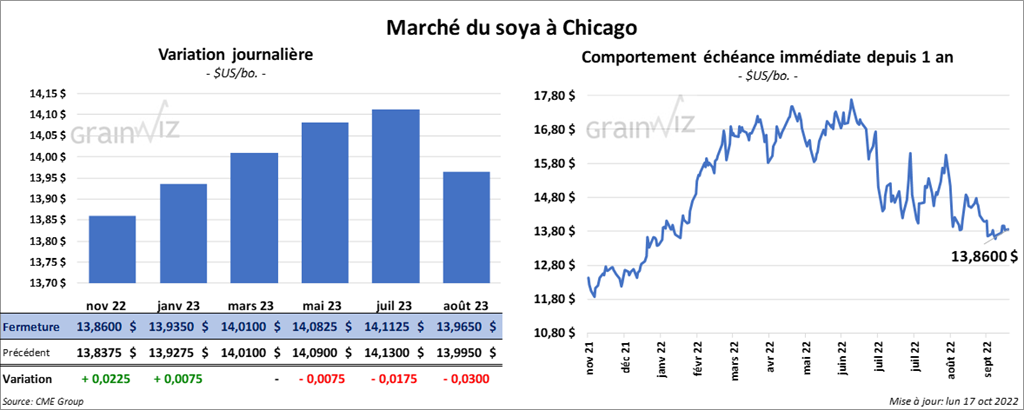 Les contrats de soya US aux échéances les plus rapprochées ont clôturé avec des gains entre ¼ et ¾ cent. Celui mars 23 a fait exception en terminant au neutre. Ceux de tourteau de soya US aux échéances les plus rapprochées ont fini la journée en baisse entre 90 cents et 1,80 $/tonne. Celui décembre 22 a fait exception en fermant en hausse de 10 cents/tonne. Les contrats d’huile de soya US aux échéances les plus rapprochées ont terminé la session en progression entre 120 et 150 points.
