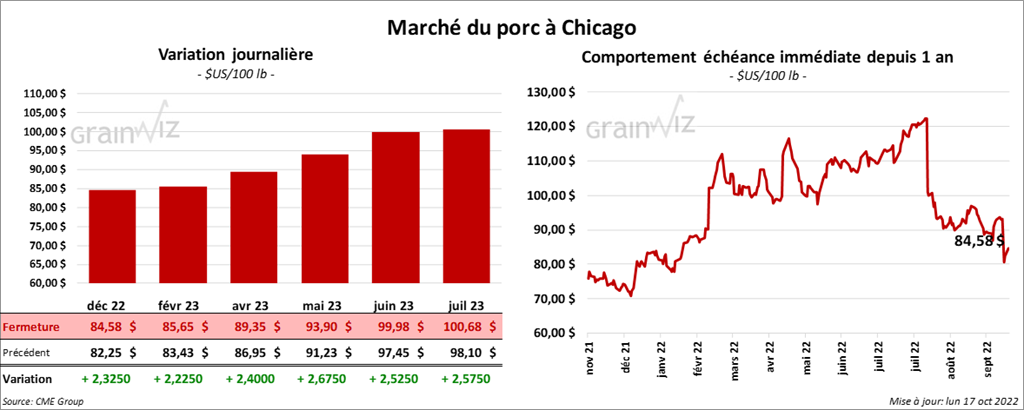 - Le 13 octobre dernier, le CME Lean Hog Index était en hausse de 42 cents à 93,09 $.