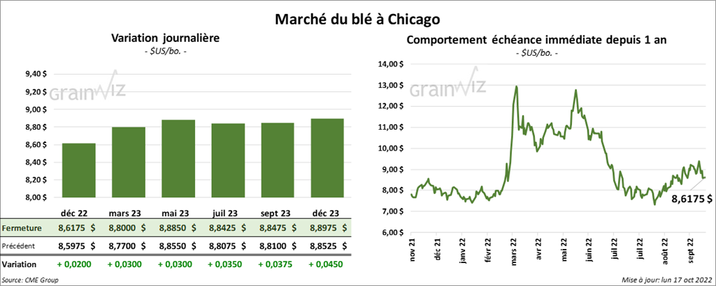 À Chicago, les contrats de blé aux échéances les plus rapprochées ont fini la séance avec des gains entre 2 et 3 cents. À Kansas, ceux de blé dur rouge aux échéances les plus rapprochées ont clôturé entre une baisse de ¼ et une hausse de ¼ cent. À Minneapolis, les contrats de blé de printemps aux échéances les plus rapprochées ont terminé entre une augmentation de 1,00 $ et une baisse de 2,00 $.