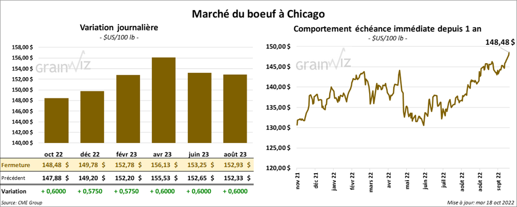 - Le 17 octobre dernier, le CME Feeder Cattle Index était en baisse de 81 cents à 172,27 $.