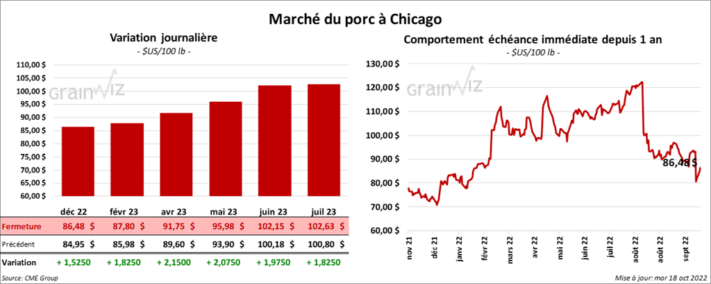 - Le 14 octobre dernier, le CME Lean Hog Index était en hausse de 26 cents à 93,35 $.