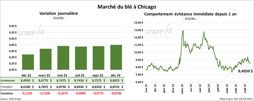 À Chicago, les contrats de blé aux échéances les plus rapprochées ont terminé la session en baisse entre 10 ¾ et 11 ½ cents. À Kansas, les contrats de blé dur rouge aux échéances les plus rapprochées ont aussi clôturé en recul entre 7 ½ et 8 ½ cents. À Minneapolis, les contrats de blé de printemps aux échéances les plus rapprochées ont fini entre une baisse de ¼ cent et une hausse de ¾ cent.