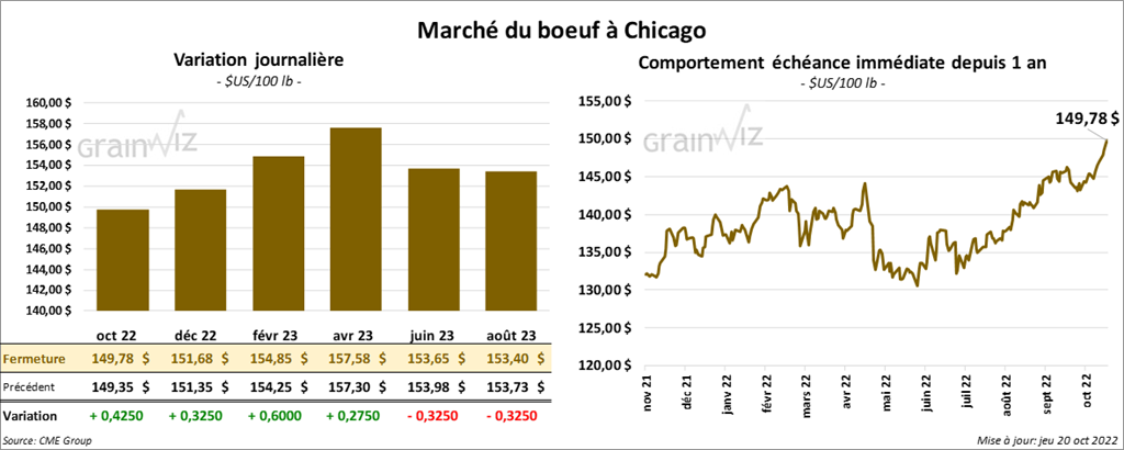 - Le 19 octobre dernier, le CME Feeder Cattle Index était en hausse de 74 cents à 172,77 $.