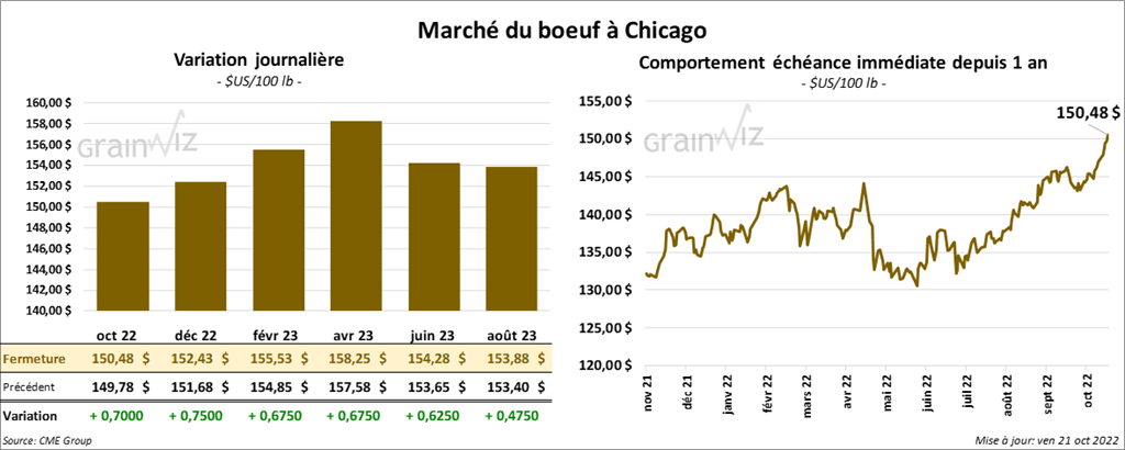 Les contrats de bœuf US aux échéances les plus rapprochées ont fini la session en hausse entre 67 et 75 cents. Ceux de veau US aux échéances les plus rapprochées ont également clôturé avec des gains entre 80 cents et 1,12 $. Celui octobre 22 a fait exception en terminant en baisse de 30 cents.