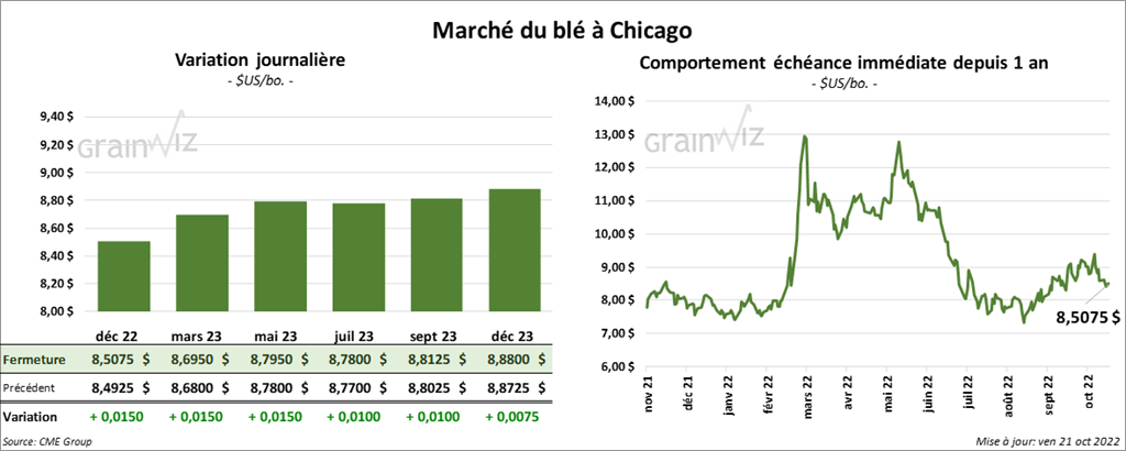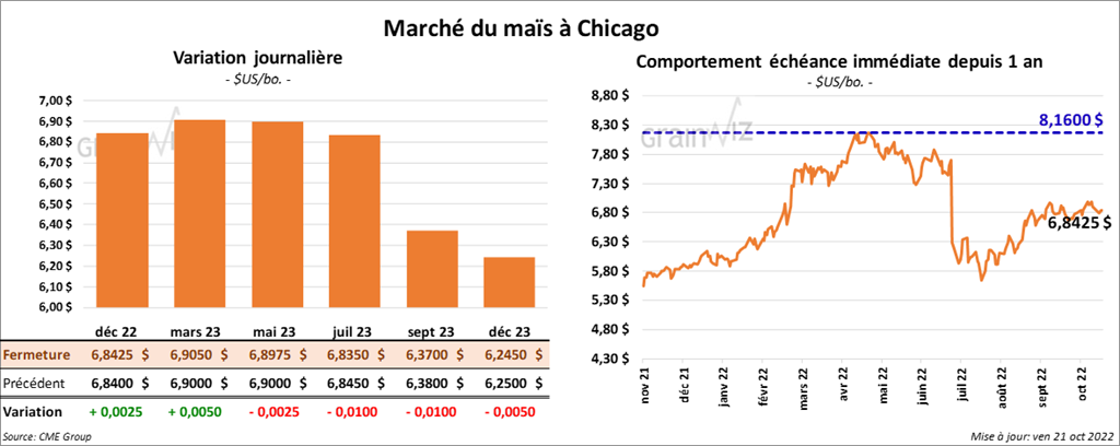 Les contrats de maïs US aux échéances les plus rapprochées ont terminé la séance en hausse entre ¼ et ½ cent. Celui mai 23 a fait exception en fermant en baisse de ¼ cent.
