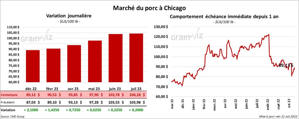 - Le 19 octobre dernier, le CME Lean Hog Index était en hausse de 56 cents à 93,76 $.