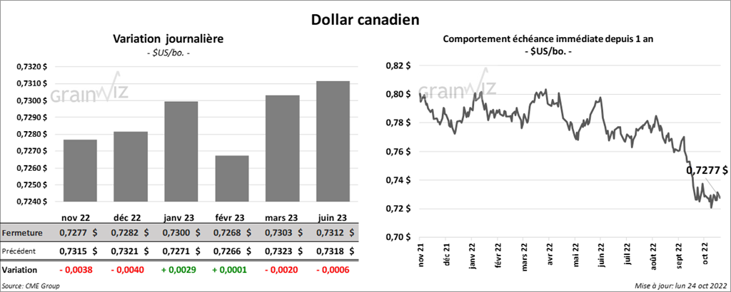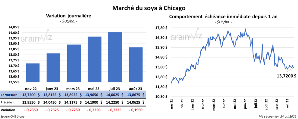 Les contrats de soya US aux échéances les plus rapprochées ont fermé la session en recul entre 22 ½ et 23 ½ cents. Ceux de tourteau de soya US aux échéances les plus rapprochées ont également clôturé avec des pertes entre 7,10 et 9,20 $/tonne. Les contrats d’huile de soya US aux échéances les plus rapprochées ont fait l’inverse en fermant en hausse entre 19 et 37 points.