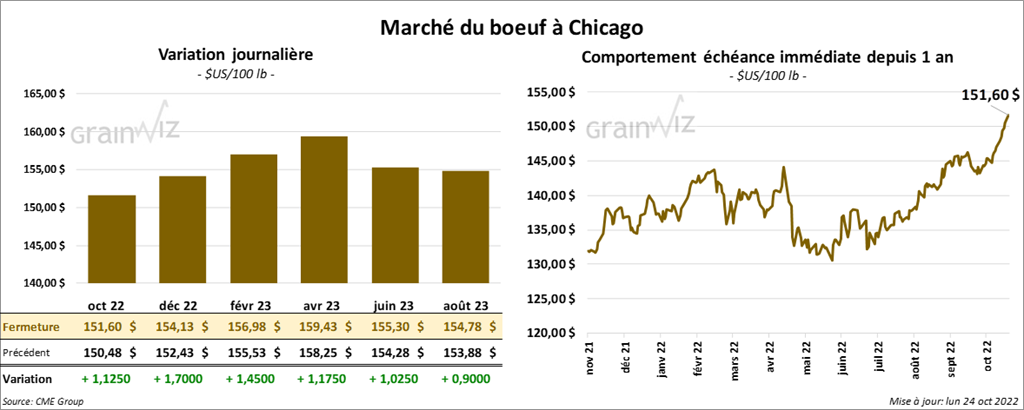 - Le 21 octobre dernier, le CME Feeder Cattle Index était en hausse de 68 cents à 173,62 $.