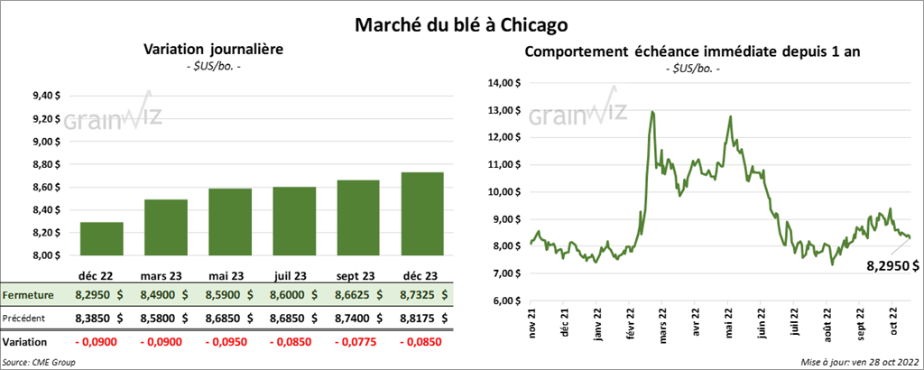 À Chicago, les contrats de blé aux échéances les plus rapprochées ont fini en baisse entre 9 et 9 ½ cents. À Kansas, ceux de blé dur rouge aux échéances les plus rapprochées ont également terminé en recul entre 6 ½ et 7 ¼ cents. À Minneapolis, les contrats de blé de printemps aux échéances les plus rapprochées ont clôturé avec des pertes entre 4 ¾ et 5 ½ cents.