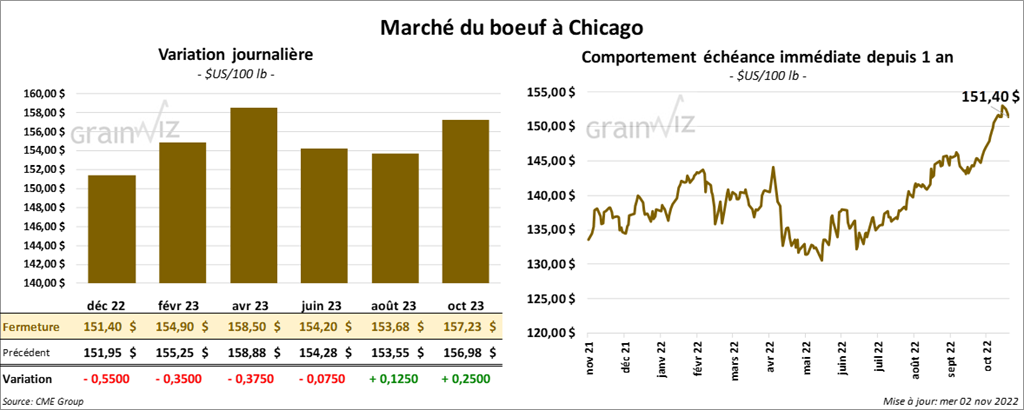 - Le 1er novembre dernier, le CME Feeder Cattle Index était en hausse de 32 cents à 177,29 $.