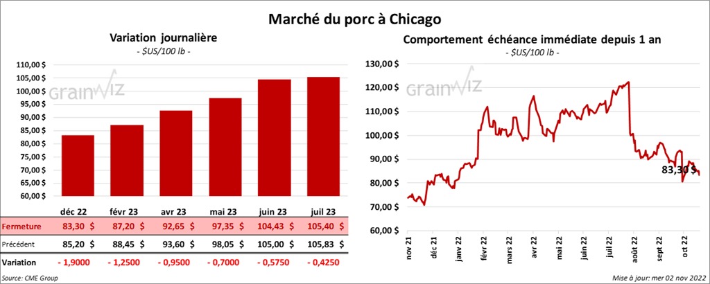 - Le 31 octobre dernier, le CME Lean Hog Index était en baisse de 4 cents à 93,75 $.