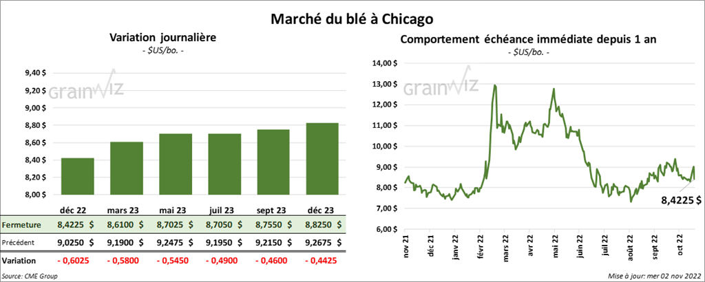 À Chicago, les contrats de blé aux échéances les plus rapprochées ont fini la session en recul entre 54 ½ et 60 ¼ cents. À Kansas, ceux de blé dur rouge aux échéances les plus rapprochées ont également terminé avec des pertes entre 46 ½ et 49 ¾ cents. À Minneapolis, les contrats de blé de printemps aux échéances les plus rapprochées ont clôturé en baisse entre 40 ¼ et 41 cents.