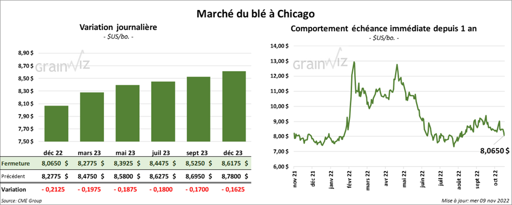À Chicago, les contrats de blé aux échéances les plus rapprochées ont fermé en baisse entre 18 ¾ et 21 ¼ cents. À Kansas, ceux de blé dur rouge aux échéances les plus rapprochées ont également terminé la séance en recul entre 14 ¾ et 15 ¾ cents. À Minneapolis, les contrats de blé de printemps ont clôturé avec des pertes entre 12 ¼ et 12 ¾ cents.