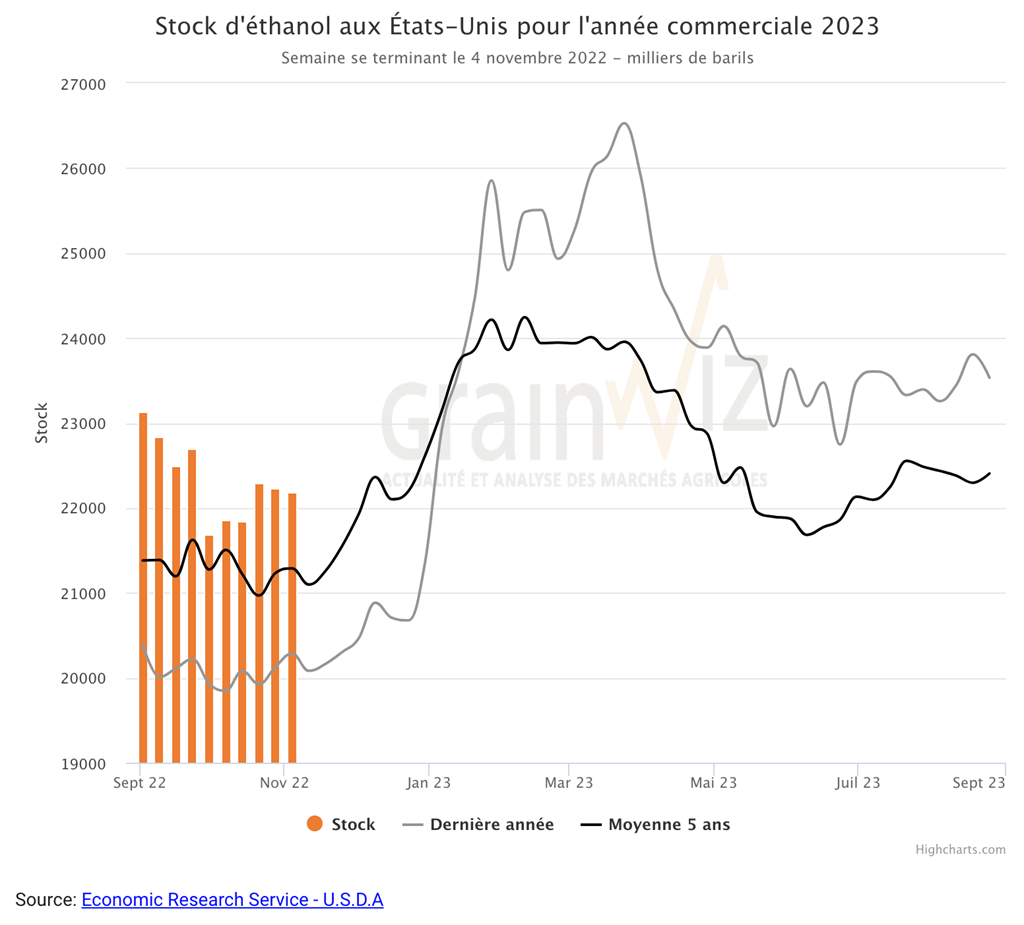 Quant aux stocks d’éthanol US, ils ont été de 22,192 millions de barils, soit à une baisse de 0,2 % comparativement à la semaine précédente et à une augmentation de 9,4 % comparativement à l’an dernier. Les anticipations des analystes étaient de 22,257 millions de barils.