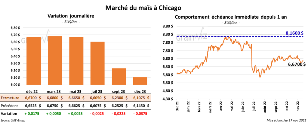- Durant la semaine du 10 novembre dernier, les ventes à l’exportation de maïs US 2022/23 ont été de 1,169,700 tonnes. Le Mexique et le Canada ont été les principaux acheteurs. Les anticipations des analystes étaient entre 700,000 et 1,500,000 tonnes.