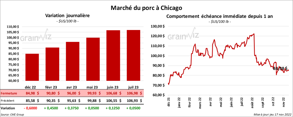 Les contrats de porc US aux échéances les plus rapprochées ont terminé avec des gains entre 37 et 45 cents. Celui décembre 22 a fait exception en finissant en recul de 60 cents.
