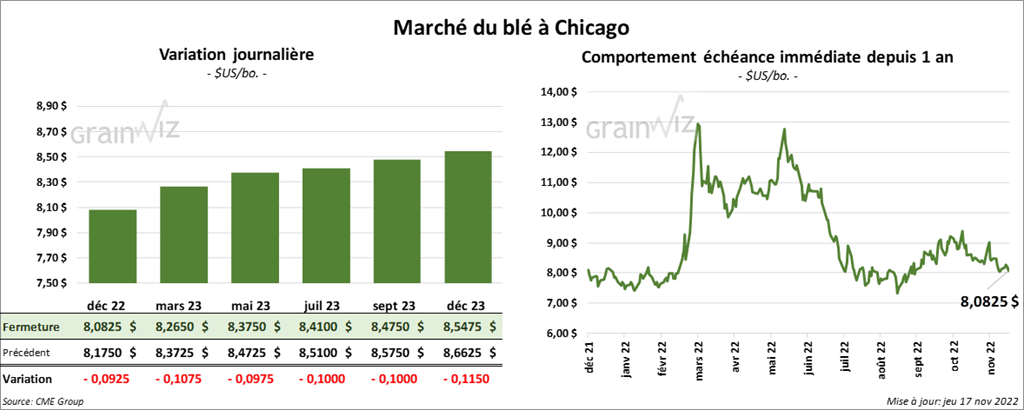 - L’accord sur les exportations de grain ukrainien à partir de la mer Noire a été prolongé sans changement pour 120 jours. Cette entente entre en vigueur dès demain. Initialement, l’accord entre les Russes, les Ukrainiens et l’ONU devait expirer samedi. Pour plusieurs analystes, la nouvelle exerce une pression négative sur les prix mondiaux du grain.