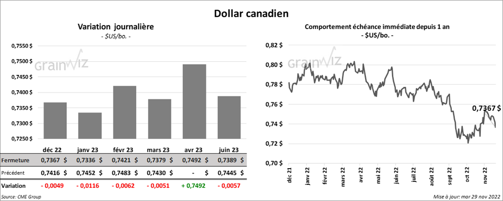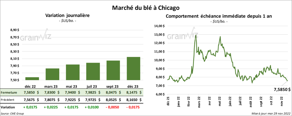 - Le dernier rapport sur la progression des cultures US de l’année 2022 a été publié aujourd’hui. Il indique qu’au 27 novembre dernier, 91 % des plants de blé d’hiver US avaient émergé comparativement à 91 % l’an dernier et à 90 % pour la moyenne des 5 dernières années. Les conditions de culture étaient passées de 32 % à 34 % dans les catégories bon/excellent. L’an dernier, à la même période, 44 % des plants se trouvaient dans les mêmes catégories. Les analystes s’attendaient plutôt à une amélioration à 33 % dans les catégories bon/excellent. La prochaine parution du rapport sur la progression des cultures US est prévue pour le 3 avril 2023.