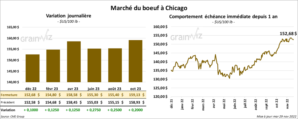 - Le 28 novembre dernier, le CME Feeder Cattle Index était en hausse de 1,66 $ à 178,85 $.