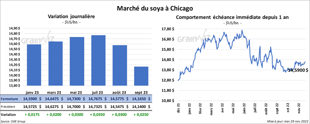 Les contrats de soya US aux échéances les plus rapprochées ont terminé la session en progression entre 1 ¾ et 3 cents. Ceux de tourteau de soya US aux échéances les plus rapprochées ont fait l’inverse en fermant en baisse entre 2,90 et 5,10 $/tonne. Les contrats d’huile de soya US aux échéances les plus rapprochées ont clôturé entre une hausse de 47 points et un recul de 14 points.