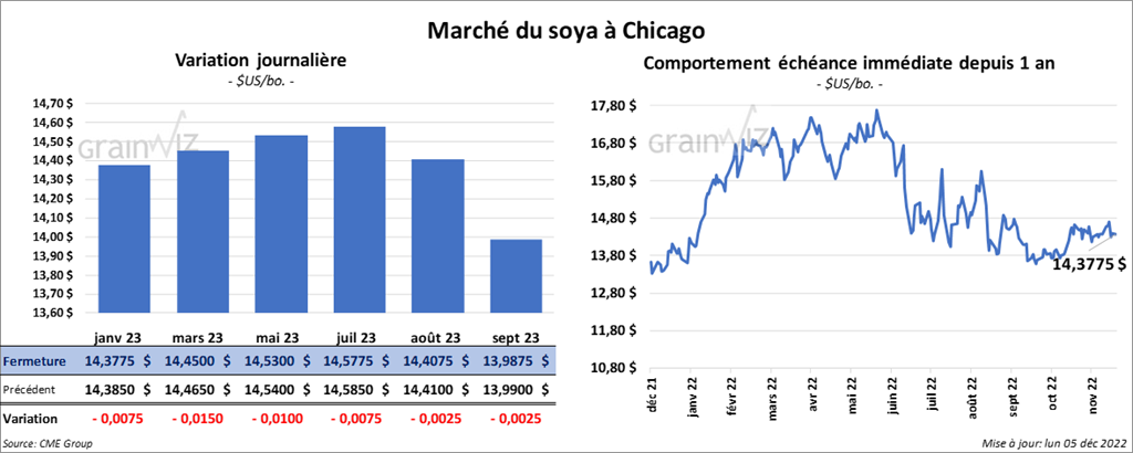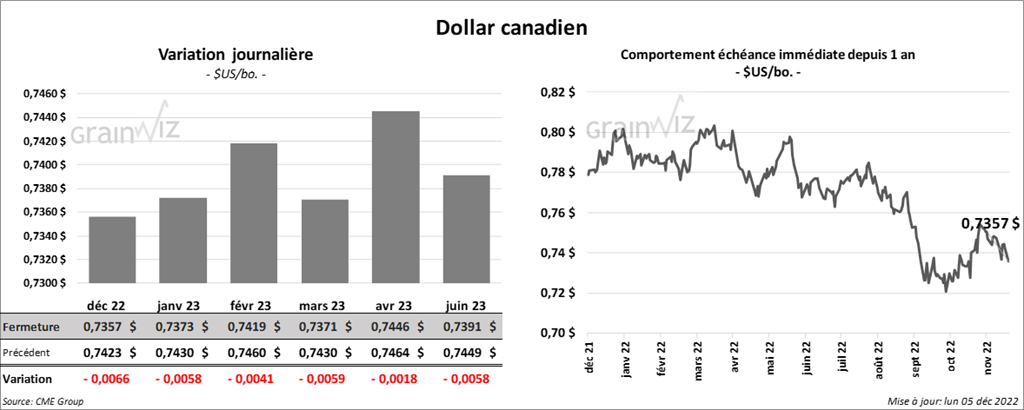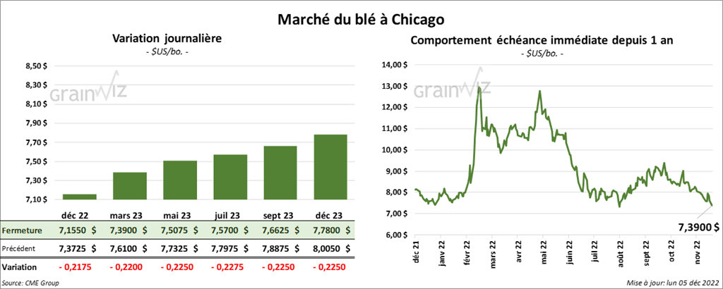 - Au cours du week-end, la Chine a continué de réduire ses restrictions sanitaires destinées à lutter contre la COVID. Les analystes espèrent donc que les Chinois vont augmenter leurs achats de commodités comme le grain dans un avenir rapproché.