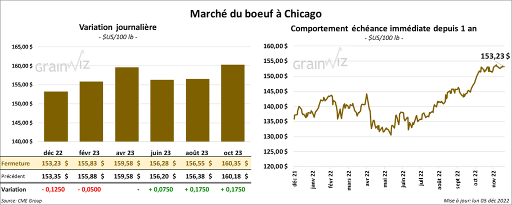 Les contrats de bœuf US aux échéances les plus rapprochées ont clôturé en baisse entre 5 et 12 cents. Celui avril 23 a fait exception en terminant au neutre. Les contrats de veau US ont fini en progression entre 90 cents et 1,32 $.