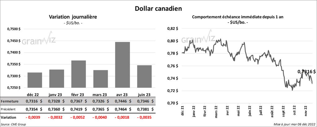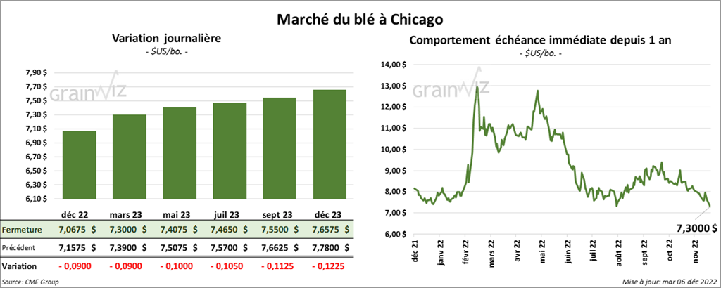 - En Chine, le gouvernement continue de réduire les restrictions sanitaires contre la COVID. Les tests de dépistage ne sont plus requis dans des villes comme Shanghai et Beijing. Hier, les autorités chinoises ont recensé moins de nouveaux cas de COVID. Les mesures sanitaires destinées à lutter contre la maladie paralysent toujours l’économie chinoise, mais les analystes espèrent que leurs assouplissements vont permettre aux Chinois d’augmenter prochainement leurs achats de commodités comme le grain.