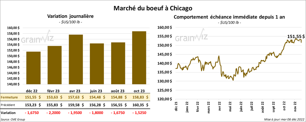 Les contrats de bœuf US aux échéances les plus rapprochées ont terminé la journée en baisse entre 1,67 et 2,20 $. Ceux de veau US aux échéances les plus rapprochées ont également fini dans le rouge entre 1,97 et 2,22 $.