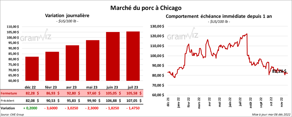 Les contrats de porc US aux échéances les plus rapprochées ont fermé en baisse entre 3,02 et 3,60 $. Celui décembre 22 a fait exception en terminant en progression de 20 cents.