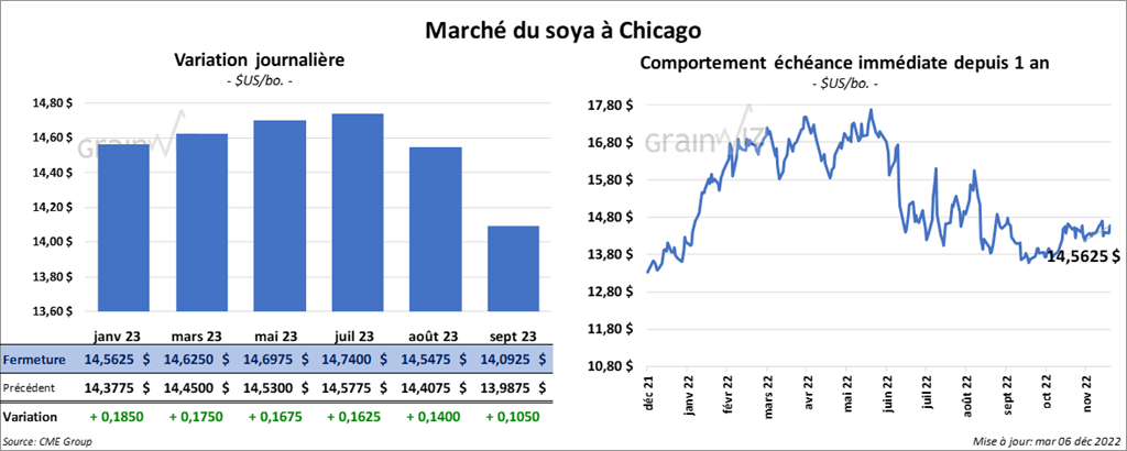 Les contrats de soya US aux échéances les plus rapprochées ont clôturé avec des gains entre 16 ¾ et 18 ½ cents. Ceux de tourteau de soya US aux échéances les plus rapprochées ont également fini en progression entre 15,40 et 17,20 $/tonne. Les contrats d’huile de soya US aux échéances les plus rapprochées ont fait l’inverse en terminant en recul entre 95 et 103 points.