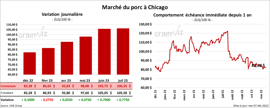 - Le 5 décembre dernier, le CME Lean Hog Index était en hausse de 15 cents à 82,94 $.