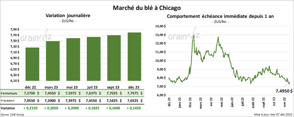 À Chicago, les contrats de blé aux échéances les plus rapprochées ont fini la journée avec des gains entre 20 et 21 ½ cents. À Kansas, ceux de blé dur rouge aux échéances les plus rapprochées ont terminé en hausse entre 18 ½ et 18 ¾ cents. À Minneapolis, les contrats de blé de printemps aux échéances les plus rapprochées ont clôturé en progression entre 5 ¼ et 6 ¼ cents.