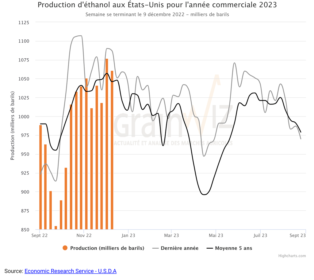 Durant la semaine du 9 décembre dernier, la production moyenne d’éthanol US a été de 1,061 million de barils par jour, ce qui représentait une baisse de 1,5 % comparativement à la semaine précédente et une réduction de 2,4 % par rapport à l’an passé. Les attentes des analystes étaient une moyenne de 1,063 million de bpj. Au total, pour la semaine, la production d’éthanol US a été de 7,427 millions de barils. 106,6 millions de boisseaux de maïs ont été utilisés dans la fabrication de l’éthanol US.