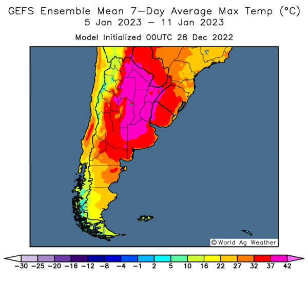 - Selon World Weather, des averses sont attendues dans la nuit de dimanche à lundi prochain dans plusieurs régions de l’Argentine. Toutefois, elles ne devraient pas suffire pour réduire les effets des températures extrêmes prévues la semaine prochaine. Globalement, les conditions de culture demeurent difficiles en Argentine, surtout avec la sécheresse persistante qui rend l’humidité du sol trop déficiente.