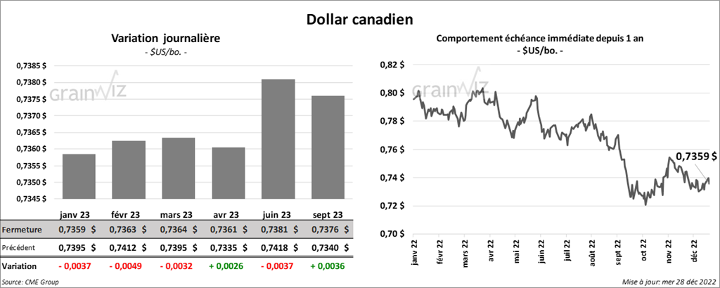 - La semaine dernière, les prix du blé russe étaient en baisse à cause de la faiblesse du rouble et de l’offre élevée causée par la récolte record de blé russe. Par contre, de son côté, SovEcon a estimé que la semaine dernière, les exportations de blé russe avaient augmenté de 840,000 tonnes à 1,1 million de tonnes. Cette hausse s’expliquerait surtout par la reprise des activités dans la mer Noire, juste après les tempêtes qui ont touché la région. La firme prévoit la production de blé russe 2022/23 à 101,2 millions de tonnes, ce qui représente une augmentation de 300,000 tonnes comparativement à sa projection précédente. Les rendements auraient été meilleurs que prévu dans le centre de la Russie et en Sibérie. Présentement, pour le mois de décembre, l’USDA évalue la production de blé russe à 91 millions de tonnes, ce qui est inchangé par rapport à novembre dernier.