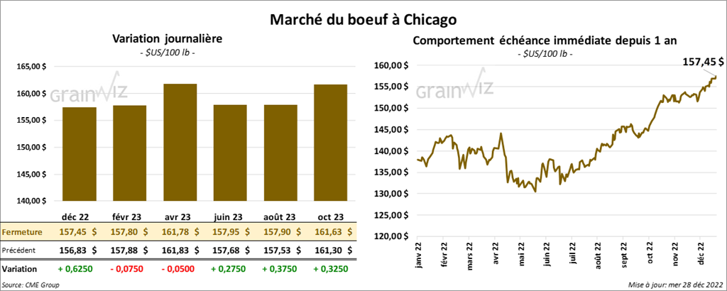 Les contrats de bœuf US aux échéances les plus rapprochées ont fermé avec des pertes entre 5 et 7 cents. Celui décembre 22 a fait exception en terminant en hausse de 62 cents. Les contrats de veau US aux échéances les plus rapprochées ont fini en progression entre 37 et 80 cents.