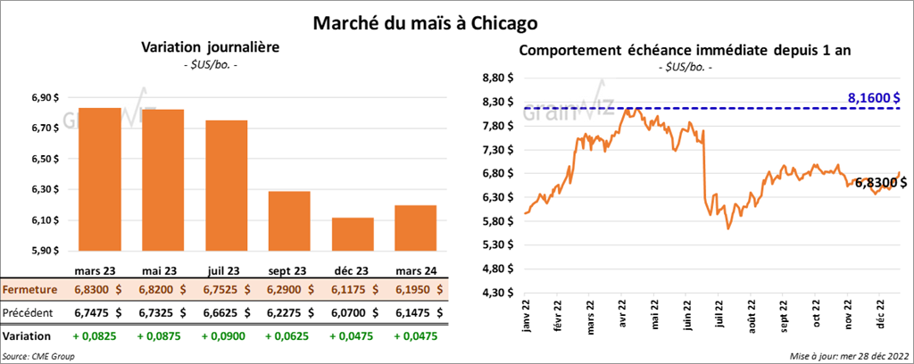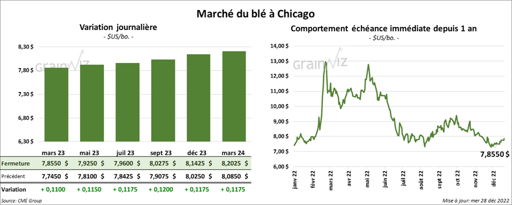 À Chicago, les contrats de blé aux échéances les plus rapprochées ont fini la session en hausse entre 11 et 11 ¾ cents. À Kansas, les contrats de blé dur rouge aux échéances les plus rapprochées ont également terminé dans le vert entre 3 et 6 cents. À Minneapolis, les contrats de blé de printemps aux échéances les plus rapprochées ont clôturé en progression entre ¼ et 1 cent. Celui mars 23 a fait exception en terminant en baisse de ¼ cent.
