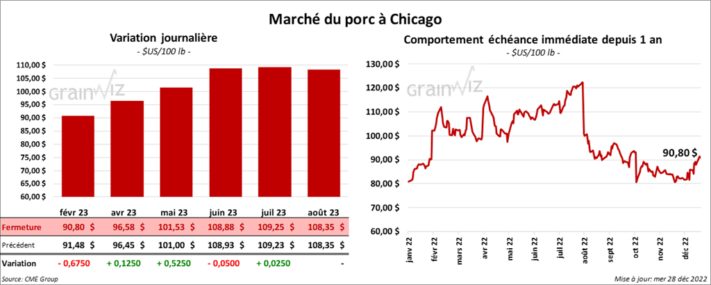 Les contrats de porc US aux échéances les plus rapprochées ont clôturé en hausse entre 12 et 52 cents. Celui février 23 a fait exception en terminant en recul de 67 cents.