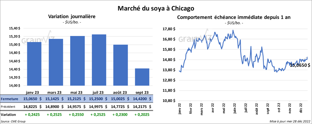 Les contrats de soya US aux échéances les plus rapprochées ont terminé la journée en hausse entre 24 ¼ et 25 ½ cents. Ceux de tourteau de soya US aux échéances les plus rapprochées ont également fini en progression entre 12,70 et 14,50 $/tonne. Les contrats d’huile de soya US aux échéances les plus rapprochées ont fait l’inverse en clôturant en baisse entre 142 et 185 points.