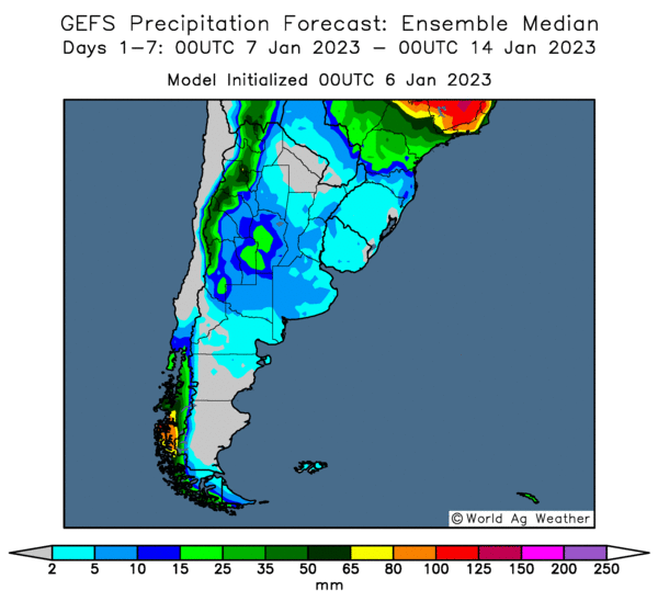 - World Weather mentionne qu’un front sera possiblement de passage en Argentine dans le courant de la semaine prochaine. Il pourrait entrainer une baisse des températures et des précipitations. Toutefois, les pluies prévues seront probablement insuffisantes pour faire régresser convenablement les effets de la sécheresse persistante depuis des semaines. Les conditions de cultures devraient donc rester difficiles en Argentine.