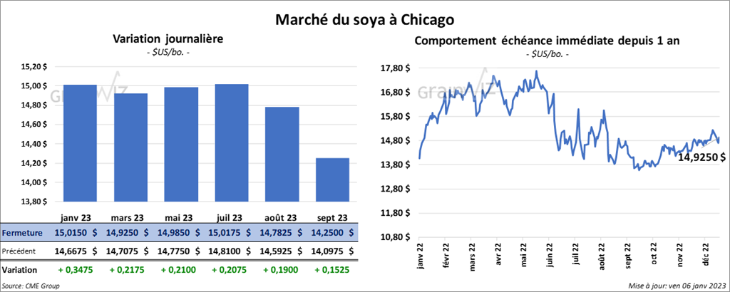 Les contrats de soya US aux échéances les plus rapprochées ont clôturé en progression entre 31 et 34 ¾ cents. Ceux de tourteau de soya US aux échéances les plus rapprochées ont également fermé dans le vert entre 9,50 et 14,40 $/tonne. Les contrats d’huile de soya aux échéances les plus rapprochées ont terminé en hausse entre 75 et 79 points.