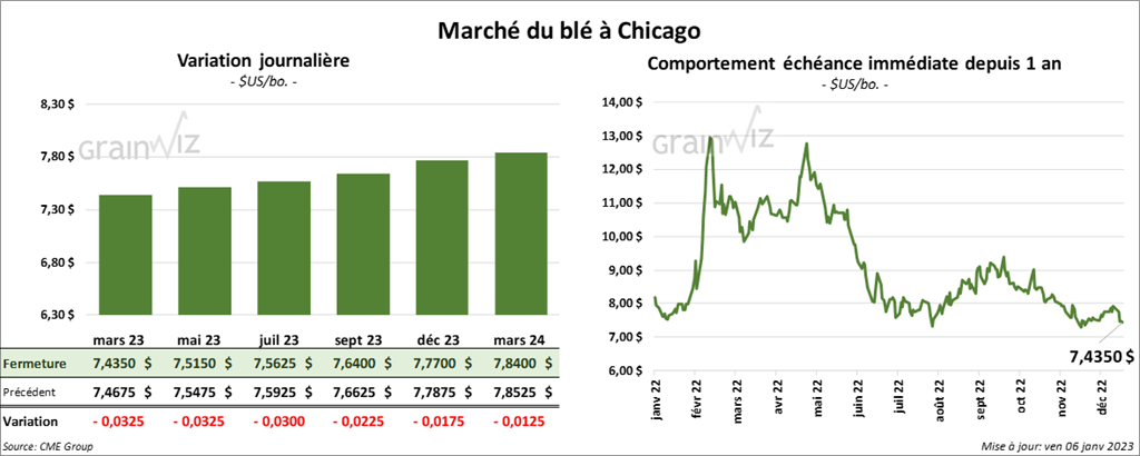 À Chicago, les contrats de blé aux échéances les plus rapprochées ont fini la session en baisse entre 3 et 3 ¼ cents. À Kansas, ceux de blé dur rouge aux échéances les plus rapprochées ont également clôturé avec des pertes entre 7 et 7 ¾ cents. À Minneapolis, les contrats de blé de printemps aux échéances les plus rapprochées ont terminé en recul entre 4 ¾ et 7 ¾ cents.