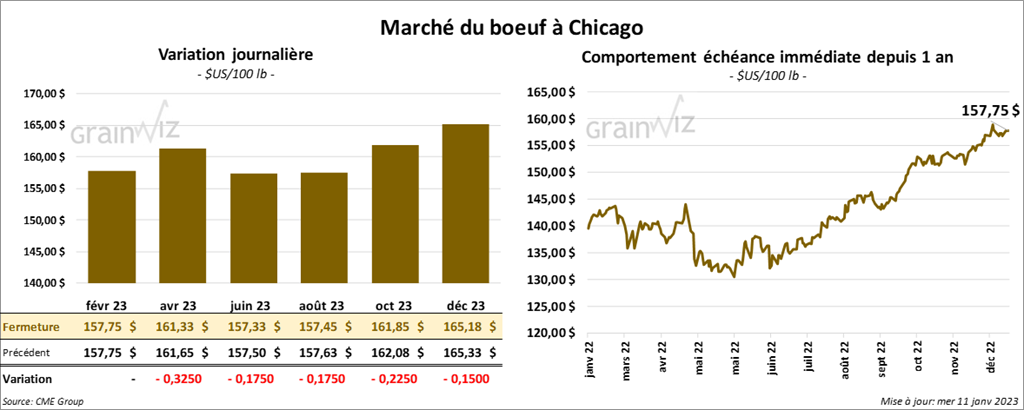 Les contrats de bœuf US aux échéances les plus rapprochées ont terminé la journée en baisse entre 17 et 32 cents. Celui février 23 a fait exception en fermant au neutre. Les contrats de veau US aux échéances les plus rapprochées ont fini en recul entre 95 cents et 1,17 $.