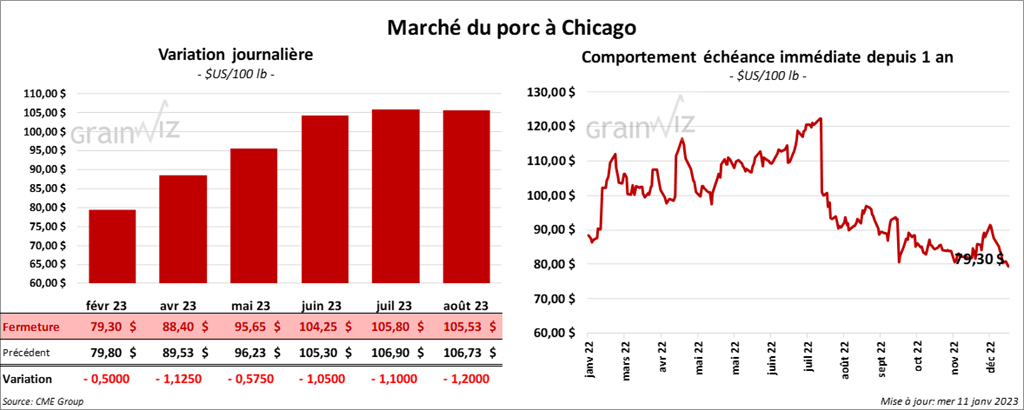 - Le 9 janvier dernier, le CME Lean Hog Index était en baisse de 35 cents à 76,44 $.