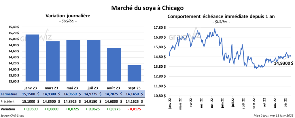 - Quant aux stocks trimestriels de soya au 1er décembre dernier, les analystes les anticipent à 3,132 milliards de boisseaux, ce qui serait une baisse comparativement aux 3,152 milliards de boisseaux établis en 2021.