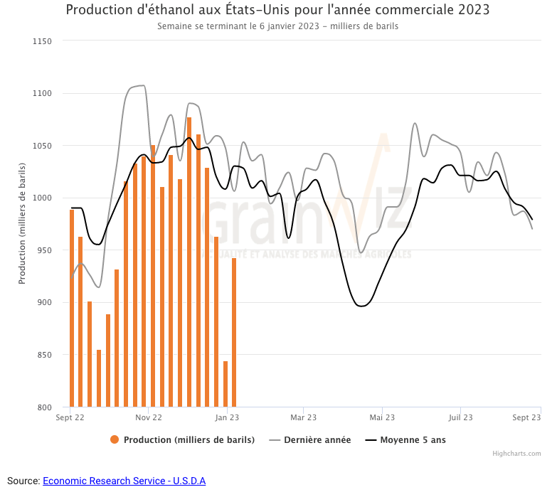 Durant la semaine du 6 janvier dernier, la production moyenne d’éthanol US a été de 943,000 millions de barils par jour, ce qui était une augmentation de 11,7 % par rapport à la semaine précédente et une baisse de 6,3 % comparativement à l’an passé. Les attentes des analystes étaient en moyenne à 959,000 bpj. Un total de 6,601 millions de barils d’éthanol US a été a été produit au cours de la semaine. 94,78 millions de boisseaux de maïs ont été utilisés dans la fabrication de l’éthanol US.