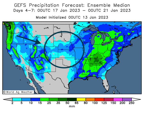 - Cette carte US dessinée pour les 4 à 7 prochains jours montre les averses prévues dans le milieu des secteurs de production de blé dur rouge d’hiver US (voir les zones bleues).